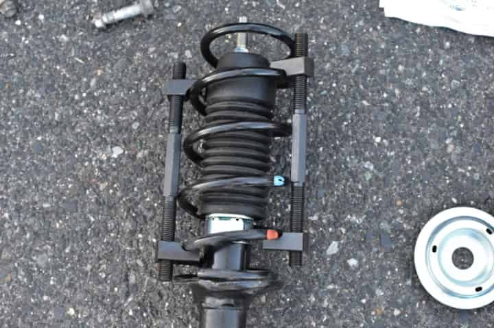 スプリングコンプレッサーを使ってスプリングを縮めていきます。